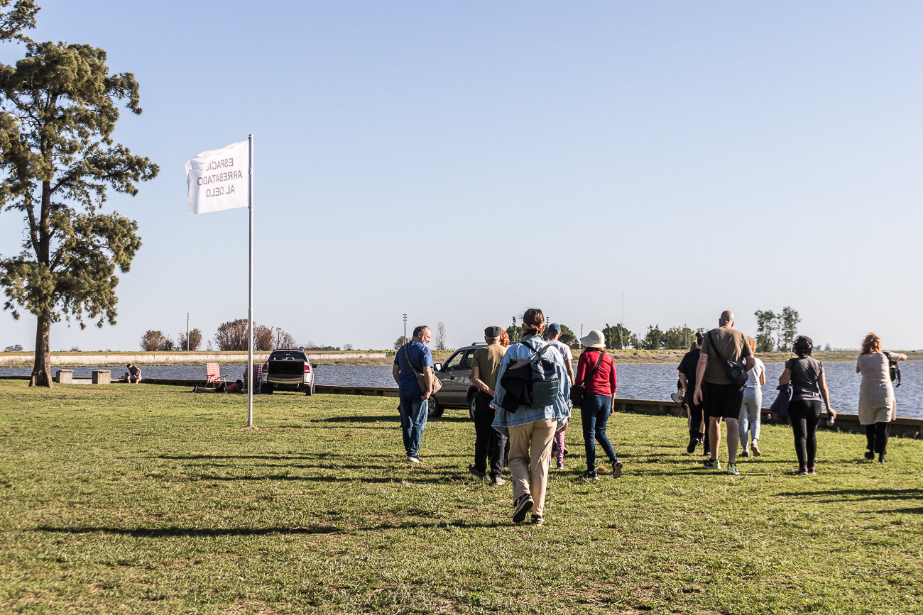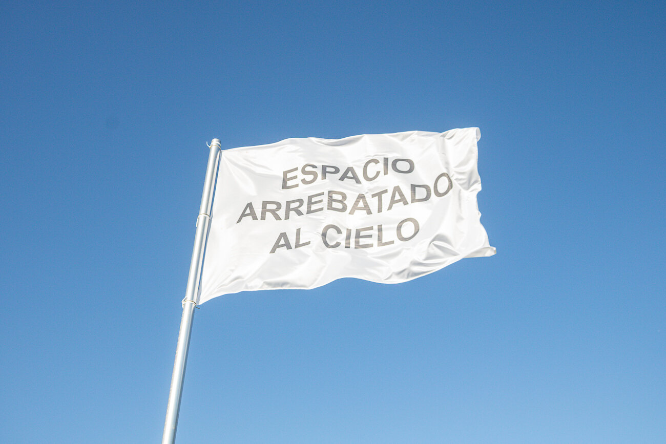 Arrebatado, de la dupla Colectiva Poética de la Urgencia, conformada por Paula Carmona y Nicolás Cox (Chile-España), arrancó un pedazo del cielo argentino. Una obra que cuestionó el espacio que le damos a las banderas, junto con el gesto fálico de izar. La ubicación de las banderas exige que siempre las miremos hacia arriba.